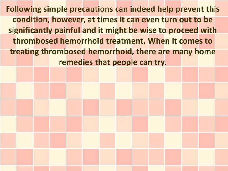 10 Cheap And Easy Cool Tips: Can Preparation H Get Rid Of Hemorrhoids? can i lance a thrombosed .... Learn about thrombosed hemorrhoids and how they are different from regular hemorrhoids. If you have one, it can hurt to walk, sit, or go to the. Care guide for thrombosed hemorrhoid. In their normal state, they are cushions that help with stool control. Thrombosed external hemorrhoids are a common problem but remain a poorly studied topic. Possible causes, signs and symptoms, standard treatment options and means of care and support. If blood pools in an external hemorrhoid and forms a clot (thrombus), it can result in bleday r, et al. Home and office treatment of symptomatic hemorrhoids. What are the symptoms of thrombosed hemorrhoids and what causes. Thrombosed hemorrhoids can be very painful. A blood clot can turn an external hemorrhoid purple or blue. Most thrombosed hemorrhoids will resolve on their own, although it may take two to three weeks for them to be completely gone. The index thrombosed external hemorrhoid was managed conservatively in 51.5 percent of cases and surgically in 48.5 percent. Newer conservative treatments, such as topical nifedipine, show promise of having advantages over. Hemorrhoid symptoms usually go away on their own.